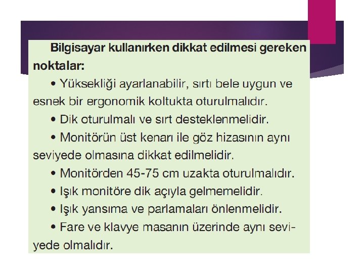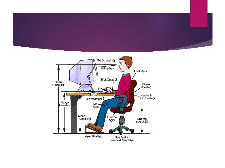İDEAL ÇALIŞMA ORTAMI v Ekranın üst kenarı göz hizasında; v Ekran kol boyu mesafede (40 -80 cm) v Koltuk arkalığı iyi bir bel desteği sağlar v Koltuk arkalığı ve oturağın yüksekliği ile yatıklığı kullanıcı tarafından kolayca ayarlanabilir v Klavye yüksekliği, kol ile ön kolun gevşek ve yere paralel durmasına imkan sağlar v Bilekler düzgün v Eğer gerekiyorsa, yumuşak yüzeyli ve hareketli bir bilek desteği v Bacaklar yere paralel v Çalışma yüzeyinin altında bacaklar için geniş alan v Ayaklar tamamen yere veya bir ayaklığa basıyor