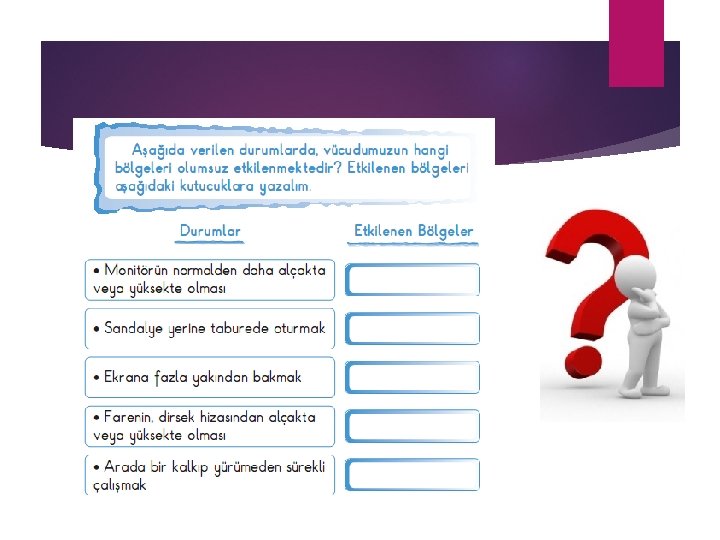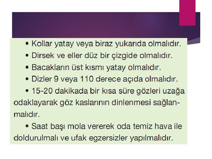 UZUN SÜRE HAREKETSİZ KALMAYIN Uzun süre hareketsiz oturmak rahatsızlık ve kas yorulmasına yol açabileceği için, çalışırken küçük molalar verilip esneme egzersizleri yapılmalıdır. Bilgisayarda uzun süre çalışacaksanız en azından saatte bir, mümkünse daha da sık olarak kısa molalar verin.
