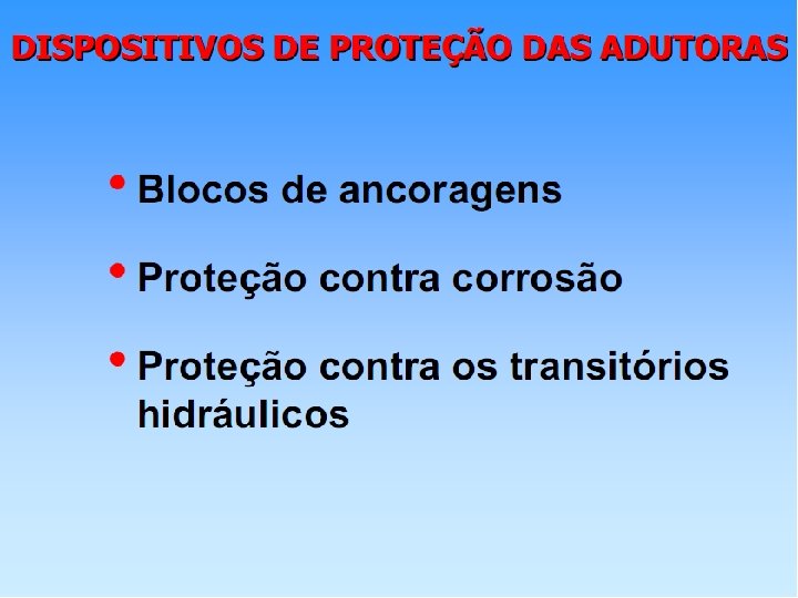 Limpeza e Reabilitação das Adutoras • Sedimentação: • Deposição de material. Geralmente quando o tratamento é inadequado (areia, silte, materiais orgânicos ou alumínio, cal ou carbonato de cálcio). Mas também pode ocorrer em águas tratadas. • Incrustação • Pode ser causada por diversos fatores: alcalinidade, dureza, presença de sólidos em suspensão, temperatura, velocidade da água e estado da superfície interna dos tubos. E também pela presença de: ferro, manganês e cálcio. • Tubos de ferro fundido não revestido – depósito de ferro insolúvel • Nas tubulações revestidas e não-metálicas – a água tratada não provoca incrustação