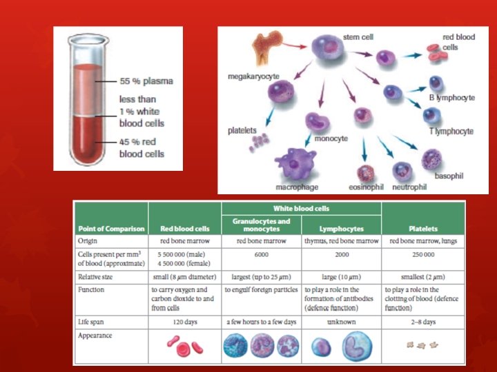 Platelets Also called thrombocytes Enucleated Produced from large nucleated cells in bone marrow. Fragments of cells that form when larger cells in bone marrow break apart. Key role in blood clotting. A sticky substance is released at injured site, platelets stick and begin build up. They form a plug to stop the bleeding. Change shape from round to spiny and release substances (thromboplastin) to trap more platelets.