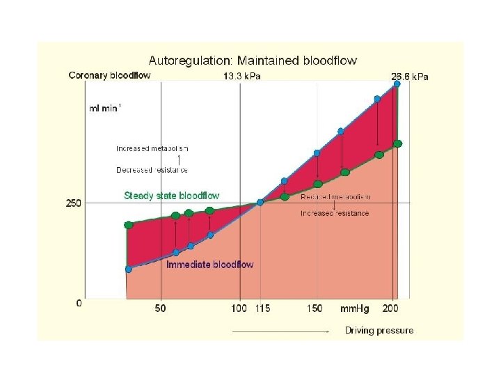 Theories of acute local control of blood flow (Cont. ) 2. The myogenic theory ; The sudden rise in flow that follows the sudden rise in pressure returns to normal within less than a minute, even though the arterial pressure is kept elevated (i. e. autoregulation). This theory is based on the reactive vascular contraction in response to pressure induced stretching of a vessel (La. Place law). The cellular mechanisms responsible for myogenic regulation are not entirely understood. It is believed that arterioles have stretch-activated calcium channels. Adding calcium to the cytoplasm from the extracellular fluid through these channels would activate the smooth muscle cell and result in contraction. Few arterioles exhibit the myogenic response; therefore, this theory is not popular.