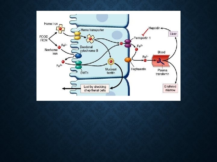 • Duodenum & upper part of small intestine: - Active transport of ferrous ions at the luminal border. - once in the intestinal mucosal cell iron is attached to a non-ferritin protein carrier & either ; transported across the serosal border to be picked up by transferrin. stored as ferritin by combing with apoferrtin. Iron absorption is dependent on: - Size of iron stores. - Rate of erythropoiesis. Normally, 10 - 15% of ingested iron is absorbed. Iron transport: In plasma; iron now in the ferric form combines to transferrin to form the ferrictransferrin complex. Iron storage = (1 gm) Site: reticuloendothelial cells (liver - spleen - bone marrow) storage forms: ferritin & haemosiderin OR