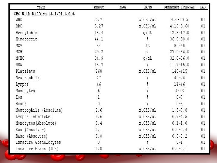 Normal values Male RBC WBC HB Platelet 4. 5 -6. 5 x 106/ l 4 – 11 x 103 / l 13 -18 g/dl Female 3. 8 -5. 8 x 106/ l 4 – 11 x 103 / l 11. 5 -16. 5 g/dl 150 -400 x 103 / l Average 4. 7– 6. 5 x 106/ l 4 – 11 x 103 / l 13 – 18 g/dl 150 -400 x 103 / l