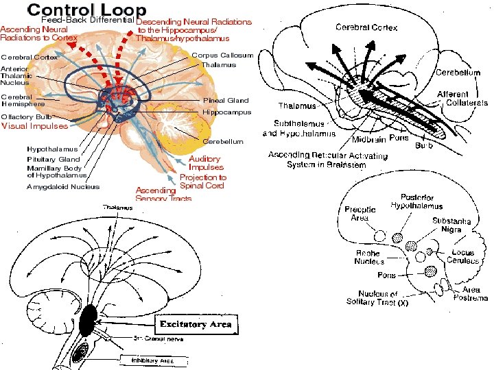 Reticular System in CNS • The reticular formation is a part of the brain that is involved in actions such as awaking/sleeping cycle, and filtering incoming stimuli to discriminate irrelevant background stimuli. It is essential for governing some of the basic functions of higher organisms, and is one of the phylogenetically oldest portions of the brain. • The reticular formation is a poorly-differentiated area of the brain stem, centered roughly in the pons. The reticular formation is the core of the brainstem running through the mid -brain, pons and medulla. The ascending reticular activating system connects to areas in the thalamus, hypothalamus, and cortex, while the descending reticular activating system connects to the cerebellum and sensory nerves. The reticular activating system is a portion of the reticular formation – concerned with sleep/wake, arousal and alertness.