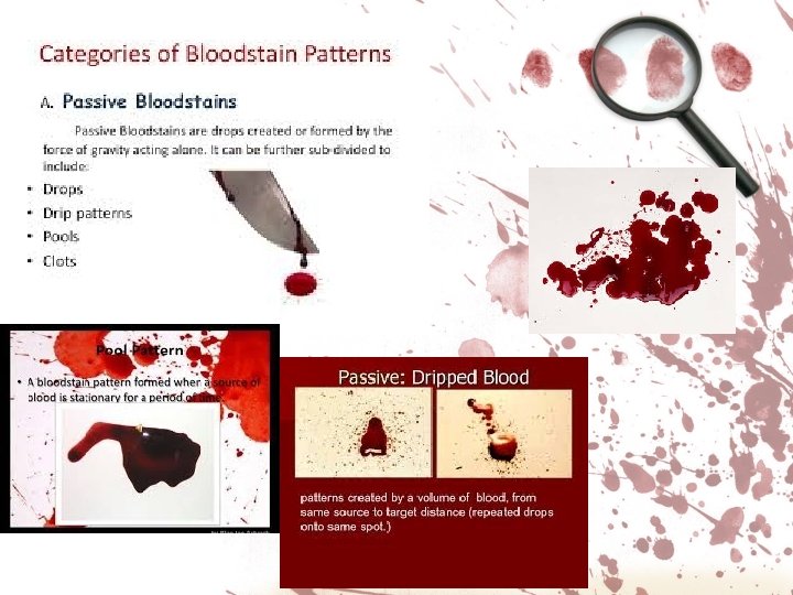 Passive Bloodstains • Passive bloodstains are drops created or formed by the force of gravity acting alone.