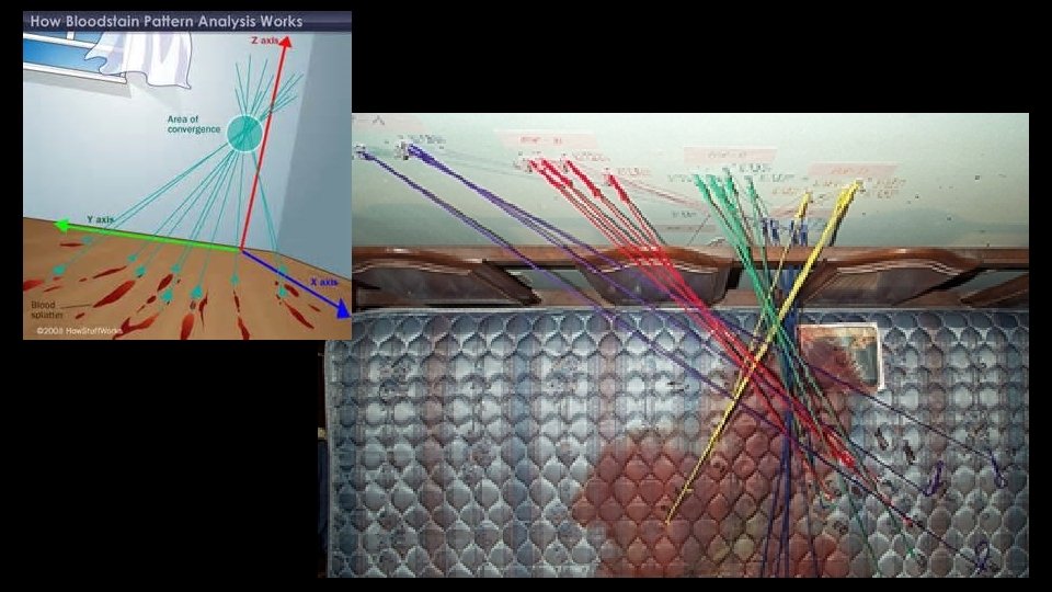 Steps on Scene 1. 2. 3. 4. 5. 6. 7. Photograph scene Presumptive blood test Sketch and measure scene Determine how many impacts are on scene Pick 5 -6 spatters/direction of impact to calculate angle of impact Use stringing method to find area of convergence Photograph after strings are set up and document height, distance of blood travel from convergence