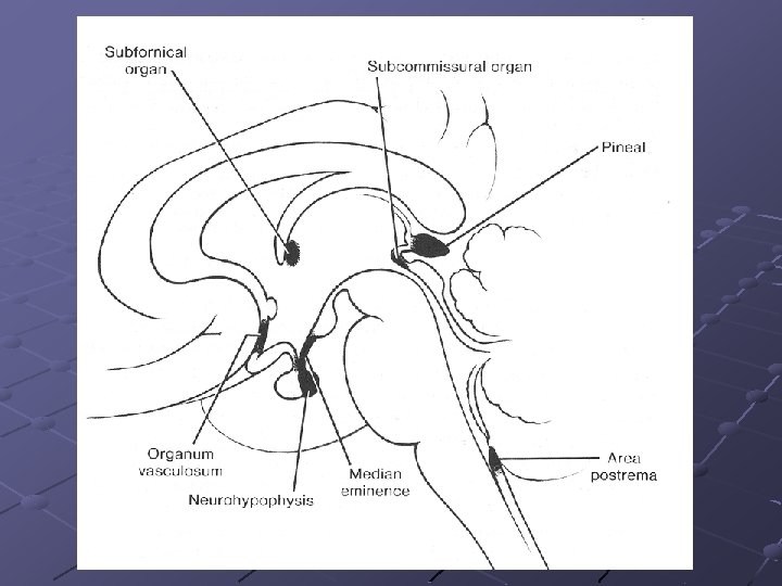 Subfornical organ sensory fluid regulation Organum vasculosum sensory, secretory detects peptides, fluid regulation Median eminence secretory regulates the anterior pituitary through the release of neurohormones Neurohypophysis secretory store and secretes the hormones oxytocin and ADH into the blood, but does not synthesize either hormone Subcommissural organ secretory secretes certain proteins into the cerebrospinal fluid, its specific function is as yet unknown. Pineal gland secretory stimulated by darkness to secrete melatonin and is associated with circadian rhythms Area postrema sensory the vomiting centre of the brain (can detect noxious substances in the blood and stimulate vomiting in order to rid the body of these toxic chemicals)