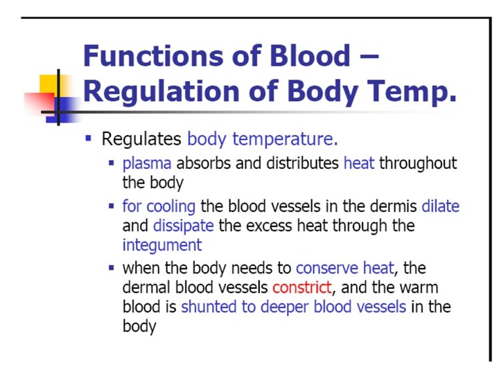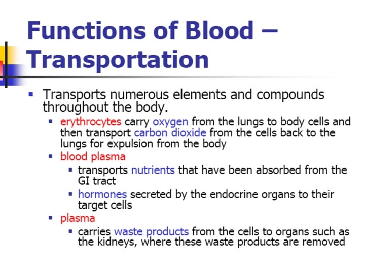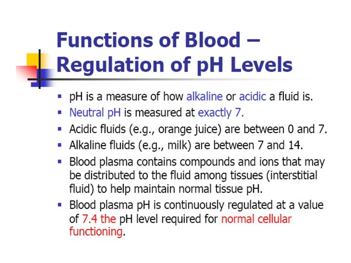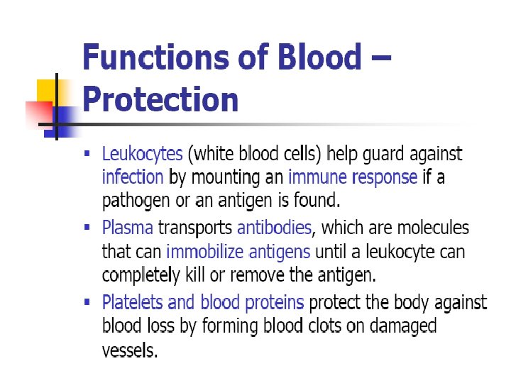 Major functions of blood • • • Transport of respiratory gases Transport of nutrients Act as vehicle Regulation of body temperature Regulation of water and electrolyte balance • Maintenance of acid-base balance • Excretory function • Defensive action