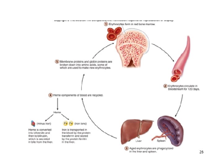 Fate of red blood cells • After an average time period of 120 days, special cells known as reticulo-endothelial cells (R. E Cells) of liver and spleen engulf (swallow) the senile (old) red blood cells and break them. • Hemoglobin is released and iron is freed from them. • The freed iron is stored in the body as ferritin and haemosiderin, which help in the formation of new hemoglobin later on. • The rest of the haem molecule is converted into some pigments such as bilirubin (yellow in color) and biliverdin (greenish in color).
