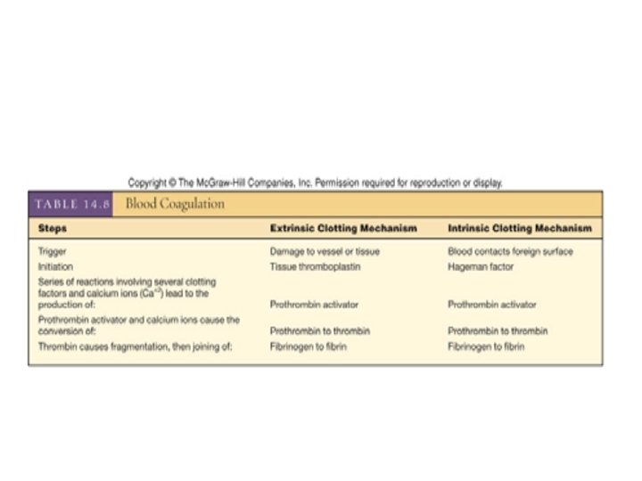 Overview of the Clotting Cascade Extrinsic Pathway: -Chemical outside the blood triggers blood coagulation. -This pathway is initiated by damaged tissues. -Damaged tissues leak tissue factor (thromboplastin) into bloodstream. • Prothrombinase forms in seconds Intrinsic Pathway: Activation occurs when – endothelium is damaged & platelets come in contact with collagen of blood vessel wall – Triggered by Hageman factor (found inside blood) – platelets damaged & release phospholipids • Requires several minutes for reaction to occur Final common pathway • Prothrombinase is formed by either the intrinsic or extrinsic pathway • Final common pathway produces fibrin threads – prothrombinase & Ca+2 convert prothrombin into thrombin – thrombin converts fibrinogen into fibrin threads – Fibrin threads trap blood cells and proteins • Clot retraction follows minutes after cascade