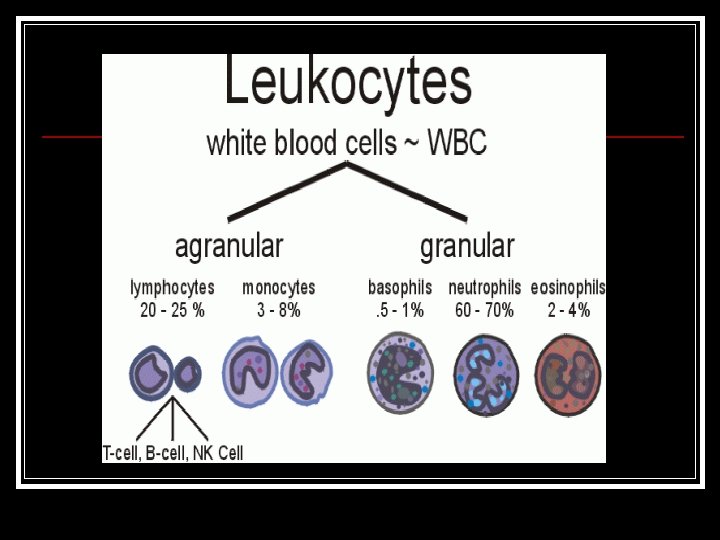 Leukocytes(wbc’s) Total Neutrophils 60 -70% n Lymphocytes 20 -25% n Monocytes 3 -8% n Eosinophils 1 -3% n Basophils ½ to 1% n (N)EVER (L)ET (M)ONKEYS (E)AT (B)ANANAS