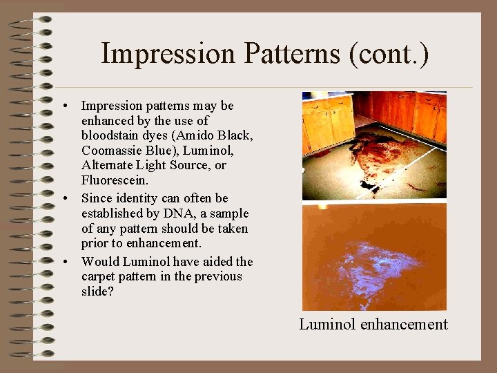 Impression Patterns (cont. ) • Impression patterns may be enhanced by the use of bloodstain dyes (Amido Black, Coomassie Blue), Luminol, Alternate Light Source, or Fluorescein. • Since identity can often be established by DNA, a sample of any pattern should be taken prior to enhancement. • Would Luminol have aided the carpet pattern in the previous slide? Luminol enhancement