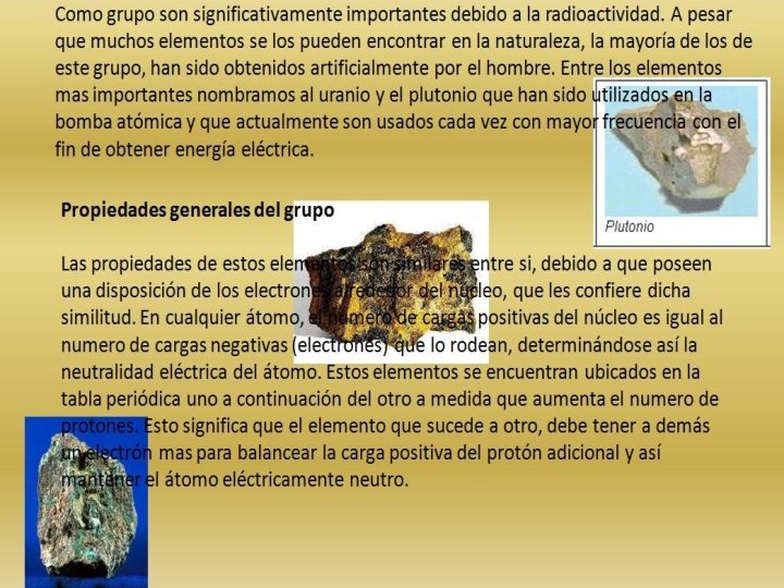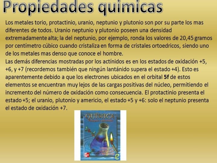 Propiedades Masa Atómica: Estados de Oxidación: Electronegatividad Radio Atómico: 238, 029 uma +3 , +4, +5, +6 1, 38 1, 56 Å Volumen Atómico: 12, 59 cm³/mol Radio Iónico: U+3 = 1, 11 Å U+4 = 0, 93 Å Potencial Estándar Punto de Fusión: Punto de Ebullición: 1ª Energía Ionización: 1ª Afinidad Electrónica: - 1, 38 v U 4+ | U 1132. 3 °C 3818 °C 584 k. J/mol 28, 9 k. J/mol Densidad: 19, 0500 g/cm³