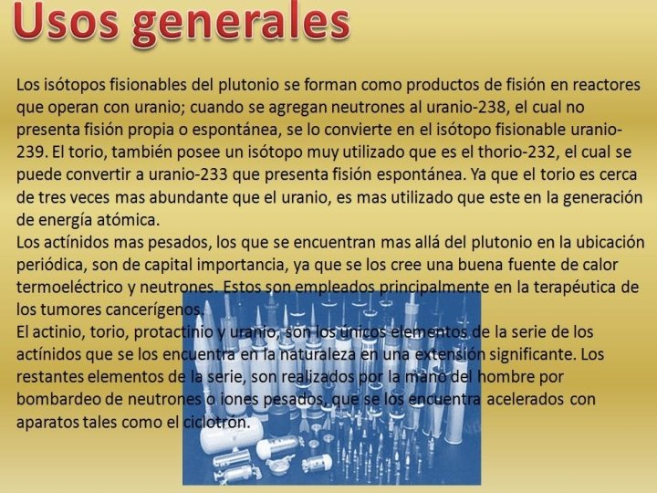 l l l Se emplea en los dispositivos inerciales de orientación en giróscopos. Todos los isótopos son importantes en la industria nuclear tanto de armamento como de producción de energía. Los compuestos se usan en la fabricación de vidrios especiales de tonos verdes (Na 2 U 2 O 7. 6 H 2 O) El 238 U, el isótopo de mayor vida media, se ha usado para determinar la edad de las rocas ígneas. Este isótopo puede convertirse en plutonio fisionable según el proceso: 238 U + n + γ 239 U + β 239 Np + β 239 Pu.