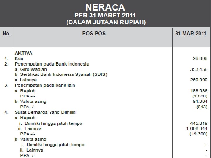 Penjelasan Neraca adalah laporan keuangan yg menunjukkan aktiva , kewajiban dan modal dari suatu perbankan pada saat tertentu. Berdasarkan tabel diatas Aktiva pada 31 maret 2011 sebesar 6. 327. 668, (dalam jutaan rupiah) dan pasivanya pun sebesar 6. 327. 668, ini menunjukkan bahwa keduanya seimbang atau balance. Piutang murabahah dalam rupiah yg terkait dengan Bank sejumlah 241, dan yg tidak terkait dengan Bank sejumlah 4. 615. 152, sedangkan Piutang murabahah dalam valuta asing yg terkait dengan Bank Rp. 0, dan yg tidak terkait dengan Bank sejumlah 2. 149, menunjukkan perbedaan yg cukup signifikan.
