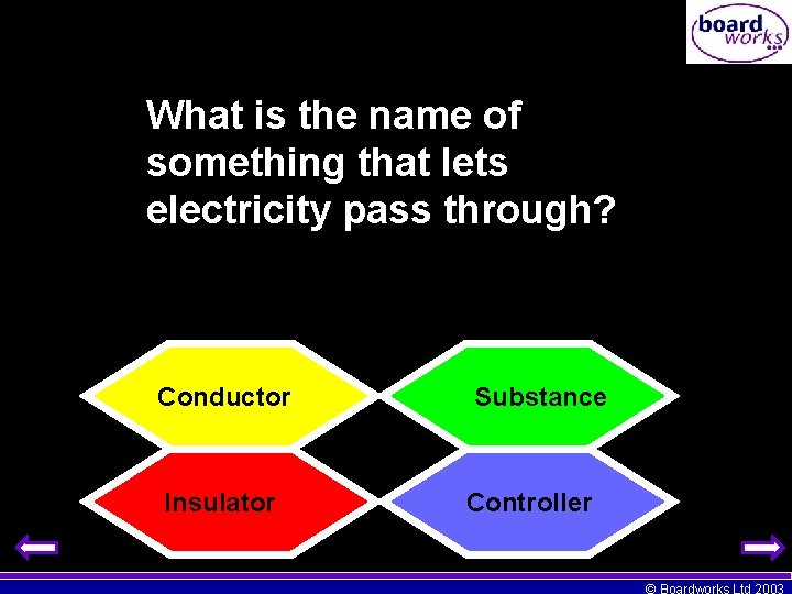 What is the name of something that lets electricity pass through? Conductor Insulator Substance Controller © Boardworks Ltd 2003