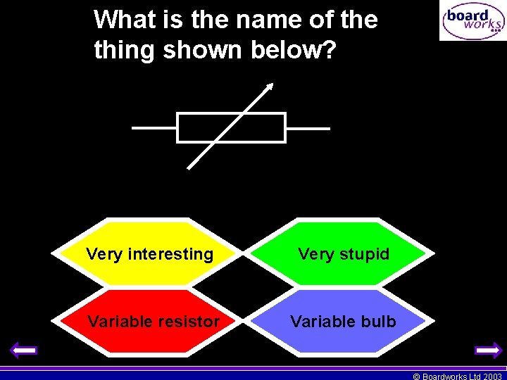 What is the name of the thing shown below? Very interesting Very stupid Variable resistor Variable bulb © Boardworks Ltd 2003