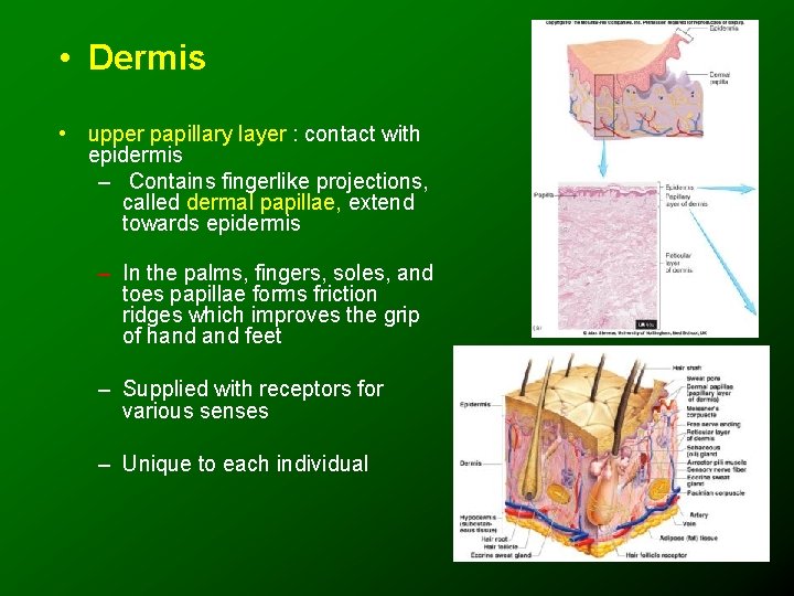 • Dermis • upper papillary layer : contact with epidermis – Contains fingerlike projections, called dermal papillae, extend towards epidermis – In the palms, fingers, soles, and toes papillae forms friction ridges which improves the grip of hand feet – Supplied with receptors for various senses – Unique to each individual