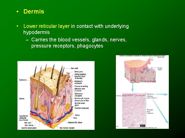 • Dermis • Lower reticular layer in contact with underlying hypodermis – Carries the blood vessels, glands, nerves, pressure receptors, phagocytes