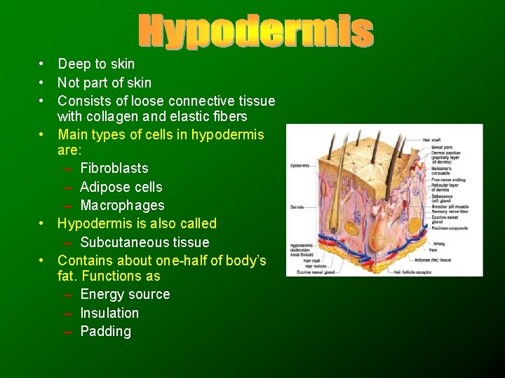 • Deep to skin • Not part of skin • Consists of loose connective tissue with collagen and elastic fibers • Main types of cells in hypodermis are: – Fibroblasts – Adipose cells – Macrophages • Hypodermis is also called – Subcutaneous tissue • Contains about one-half of body’s fat. Functions as – Energy source – Insulation – Padding