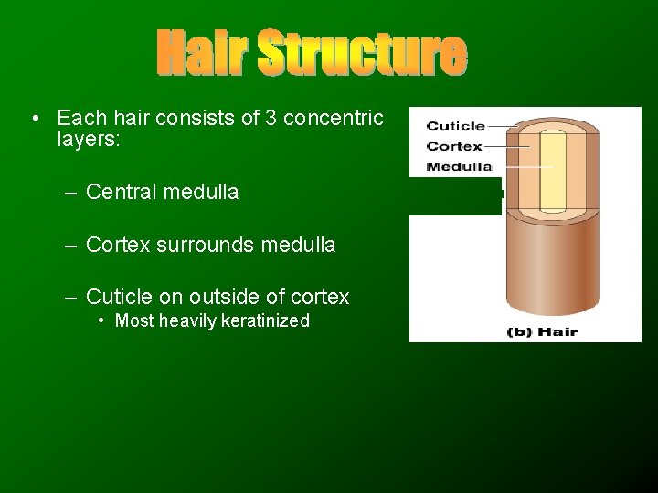 • Each hair consists of 3 concentric layers: – Central medulla – Cortex surrounds medulla – Cuticle on outside of cortex • Most heavily keratinized