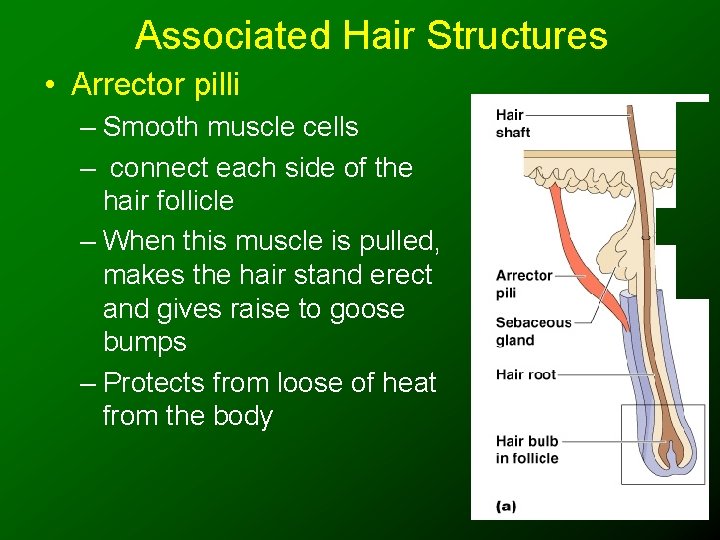Associated Hair Structures • Arrector pilli – Smooth muscle cells – connect each side of the hair follicle – When this muscle is pulled, makes the hair stand erect and gives raise to goose bumps – Protects from loose of heat from the body