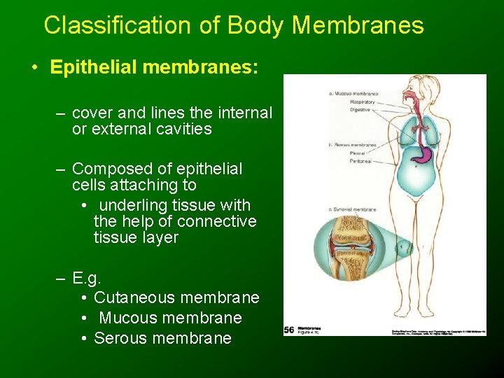 Classification of Body Membranes • Epithelial membranes: – cover and lines the internal or external cavities – Composed of epithelial cells attaching to • underling tissue with the help of connective tissue layer – E. g. • Cutaneous membrane • Mucous membrane • Serous membrane