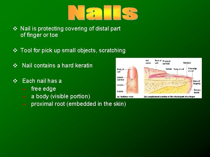v Nail is protecting covering of distal part of finger or toe v Tool for pick up small objects, scratching v Nail contains a hard keratin v Each nail has a – free edge – a body (visible portion) – proximal root (embedded in the skin)