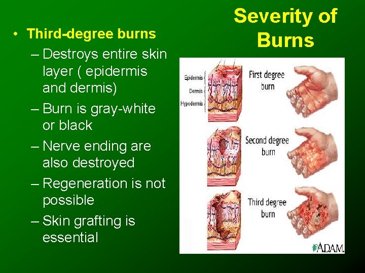 • Third-degree burns – Destroys entire skin layer ( epidermis and dermis) – Burn is gray-white or black – Nerve ending are also destroyed – Regeneration is not possible – Skin grafting is essential Severity of Burns