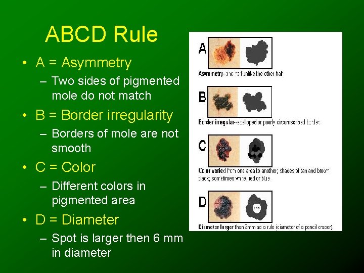 ABCD Rule • A = Asymmetry – Two sides of pigmented mole do not match • B = Border irregularity – Borders of mole are not smooth • C = Color – Different colors in pigmented area • D = Diameter – Spot is larger then 6 mm in diameter