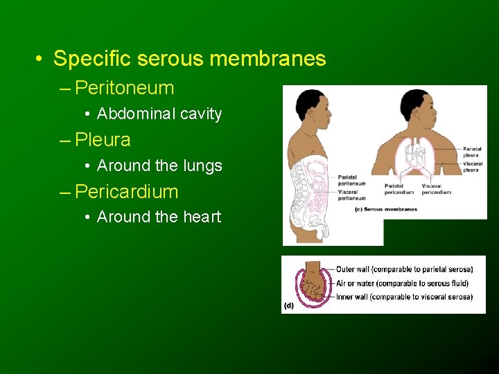 • Specific serous membranes – Peritoneum • Abdominal cavity – Pleura • Around the lungs – Pericardium • Around the heart