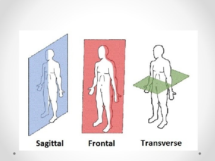 Anatomical/body planes • • Used to pinpoint or specifically locate an area of the body Remember anatomic position! Anatomical Planes: imaginary flat plates or fields 1. frontal/coronal plane: vertical plane; o Divides into anterior and posterior portions • 2. Sagittal plane: vertical plane passes from front to back o Divides body into right and left halves • 3. transverse: horizontal plane o Divides body into top and bottom halves