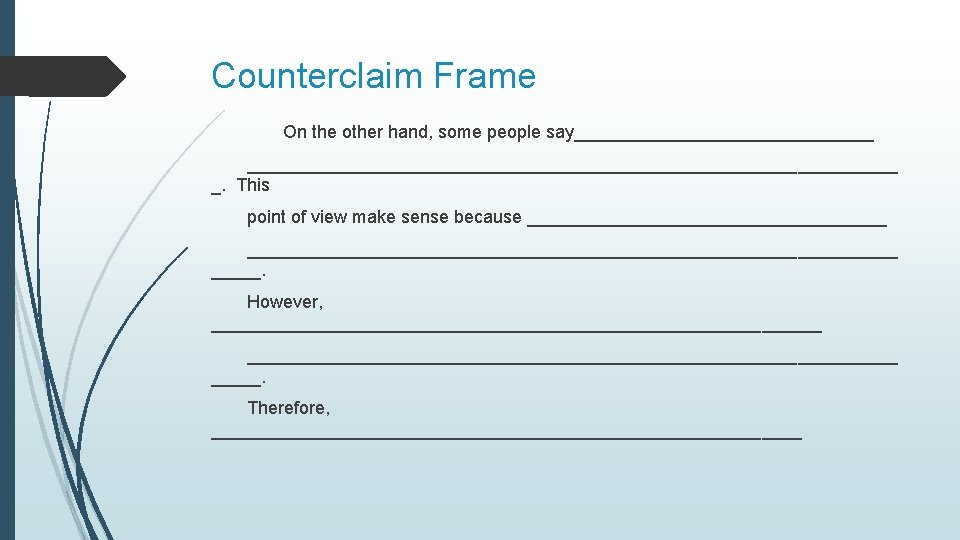 Counterclaim A counterclaim is where you talk about the other side. You give information with evidence then explain how it is not the correct side. Refute – to prove wrong by argument or evidence.