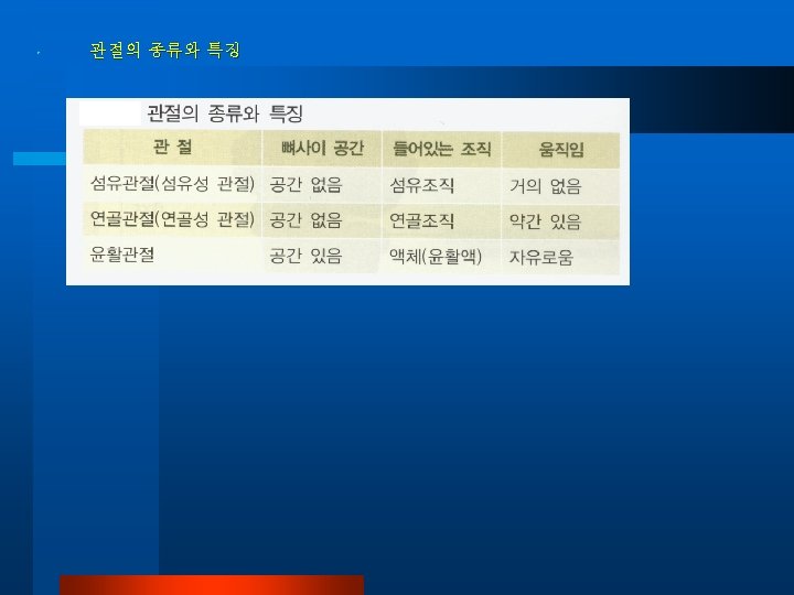 Knee joint -synovial joint Fomoral head(볼록)<->meniscus of tibia(오 목) Cartilage synovial capsule synovial cavity synovial fluid Ligament Patellar ligament Ant. /post. Cruciate lig. Media/lateral collateral lig. (tibial/fibular) Post meniscofemoral lig. Bursa