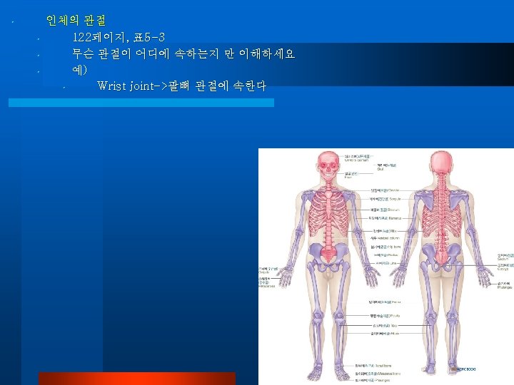 Human skeleton 206개 뼈 Axial skeleton; 80개 • Skull • Hyoid bone • Auditory ossicle • Vertebral column • Sternum • Ribs Appendicular skeleton • 126개 • Upper limb • Lower limb