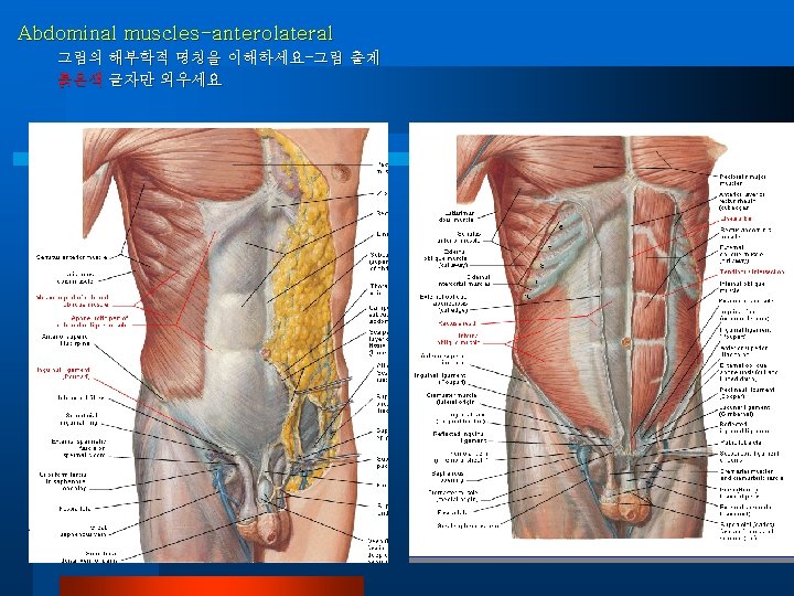 Abdominal muscels-inguinal canal Deep inguinal ring Superficial inguinal ring 통과물 남-spermatic cord 여-round ligament of uerus