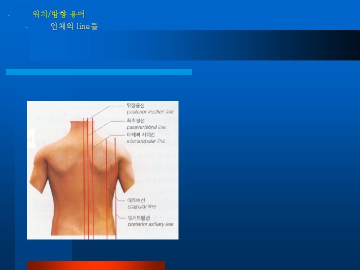 신체의 절단면 Body plane • • • 시상면 Sagittal plane 정중면 median plane 정중시상면 midsagittal line • • 시상면 중 몸의 가운데를 지나는 것 관상면 coronal plane 횡단면 transverse plane 경사면 oblique plane