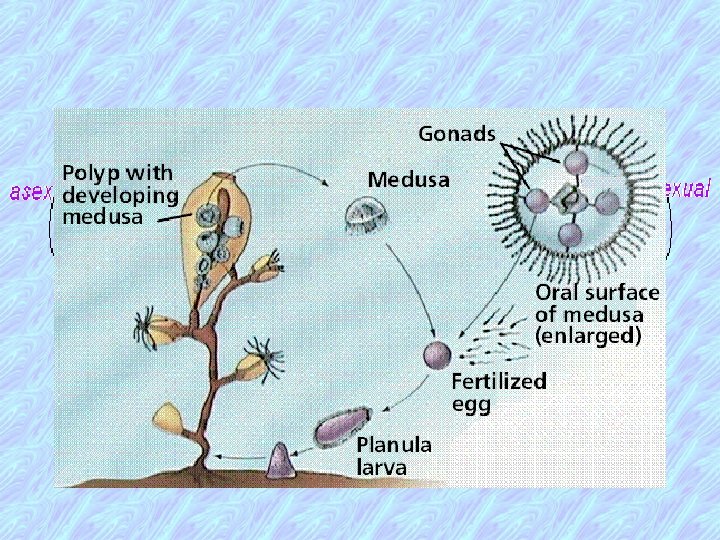 +No blood, respiratory, or excretory organs +A network of nerve cells and fibres exists in body wall +Single internal cavity with only opening to the exterior, the ‘mouth’ which is surrounded by tentacles +Reproduction by assexual budding in polyp stage, sexual reproduction by eggs and sperm in medusa stage