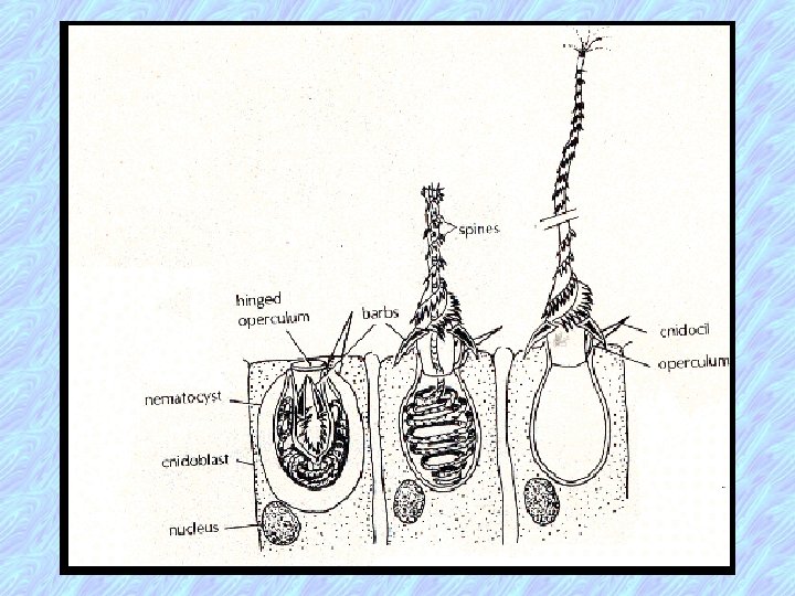 Nematoblasts + Nematoblasts 1. they are in the ectoderm 2. each consists of highly complex organelle, nematocyst, which is a minute capsule filled with fluid and containing a coiled, barbed thread tube