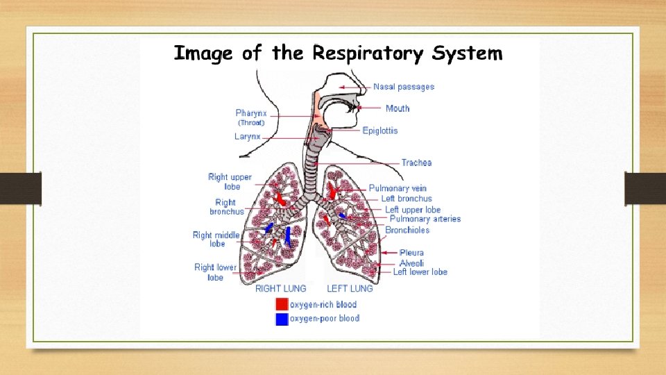 The Respiratory System: to provide the body with a fresh supply of oxygen for cellular respiration and remove the waste product carbon dioxide Bronchi – the two large passageways Major Organs and Their Functions Nose – internal entry and exit point for air Pharynx – serves as a passage way for both air and food at the back of the throat Larynx – your “voicebox”, as air passes over your vocal chords, you speak Trachea – the “windpipe”, or what connects your pharynx to your lungs-- a piece of skin, called the epiglottis, covers the trachea when you swallow, preventing food from entering that lead from the trachea to your lungs (one for each lung) -- the bronchi are further subdivided into bronchioles -- eventually, the further subdivisions lead to tiny air called alveoli sacs -- capillaries surrounding each alveolus is where the exchange of gases with the blood occurs The diaphragm is the muscle that causes you to breath