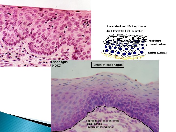 Stratified Squamous � Most common stratified epithelium in the body � Several layers of squamous cells � Cells closest to free edge are squamous shaped, but those closest to the basement membrane appear cuboidal. � Found in cites that receive a lot of abuse or friction ◦ Esophagus, mouth, outer portion of the skin
