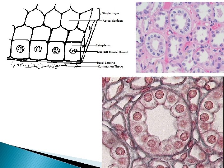 Simple Cuboidal � One � On layer of cuboidal cells a basement membrane � Common � Walls in glands and ducts of kidneys, surface of ovaries