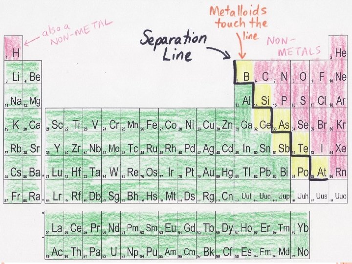 METALS, NON-METALS, AND METALLOIDS Mendeleev organized the Periodic Table by properties, which made some interesting patterns He found 3 groups: � Metals � Non-metals � Metalloids The metalloids share some properties with both metals and non-metals!