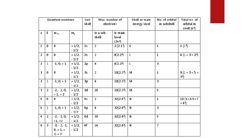 1. Principal quantum number (n) Express: Energy level Indicates: Size of Orbit Determine: Total number of electron in a shell (by 2 n 2) Value: k=1, L=2, M=3, N=4