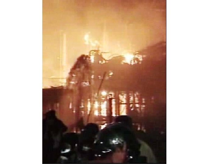 Flames light the sky after an explosion at Algeria's largest refinery and principal oil exporter in the port city of Skikda, 500 km (310 miles) east of the capital Algiers, early January 20, 2004. Rescue workers searched through rubble for missing worker on Tuesday after a huge explosion at its key gas installations killed 23 people on Monday evening, official media said.