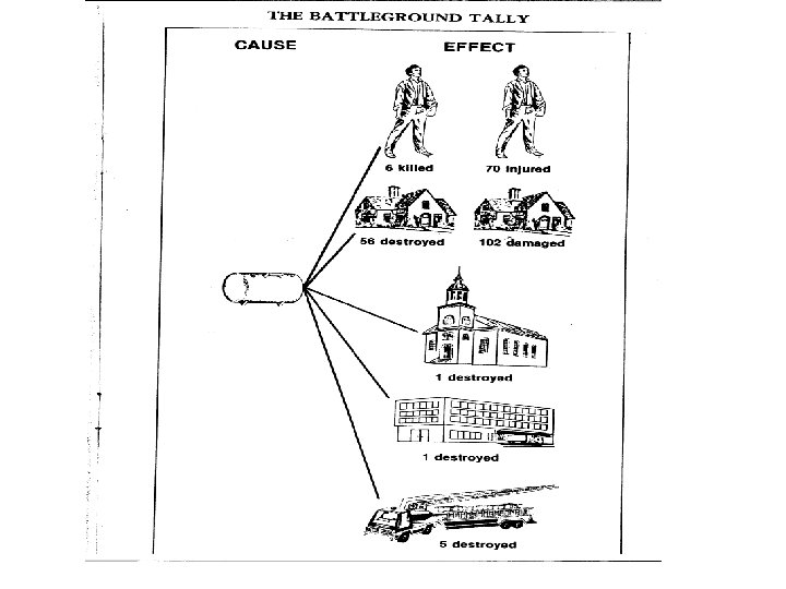 The cause was a pressure vessel measuring only three feet by eight feet, containing 230 gallons of liquid propane. The vessel was being moved via forklift when it rolled off the forks, and a nozzle broke off causing the gas to escape. LP gas being heavier than air stayed near the ground. A spark caused the gas to explode and caused the following results: