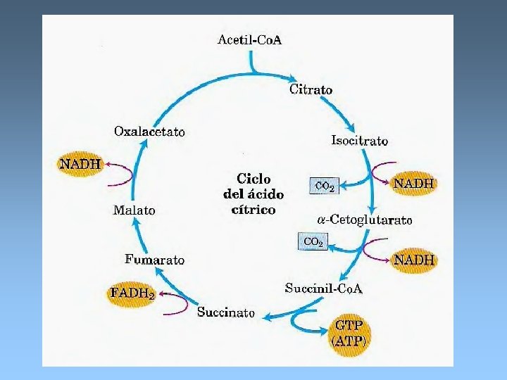 Condensación Acetil-Co. A Deshidrogenación Oxalacetato Malato Hidratación Citrato Deshidratación Cis. Aconitato Hidratación Fumarato Isocitrato Deshidrogenación Succinato Succinil-Co. A Fosforilación a nivel de sustrato a-Ceto glutarato Descarboxilación oxidativa