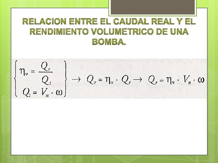 El caudal de una bomba esta determinado por la siguiente relación: CAUDAL = VOLUMEN DE DESPLAZAMIENTO * VELOCIDAD ANGULAR El caudal así obtenido es llamado caudal teórico, que es simplemente superior al caudal real en función del rendimiento volumétrico de la bomba, es decir de las fugas internas de la misma.