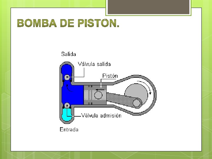 PRINCIPIO: EMPLEAN UN PISTÓN QUE IMPULSA EL FLUIDO HACIA A FUERA A TRAVÉS DE LA VÁLVULA DE DESCARGA BOMBAS RECIPROCANTE S CARACTERÍSTICAS: DESCARGA UNA CANTIDAD DEFINIDA DE LIQUIDO DURANTE EL MOVIMIENTO DEL PISTÓN. APLICACIÓN: NO SON APROPIADAS PARA MANEJAR LÍQUIDOS QUE CONTENGAN ARENAS O MATERIALES EN SUSPENSIÓN