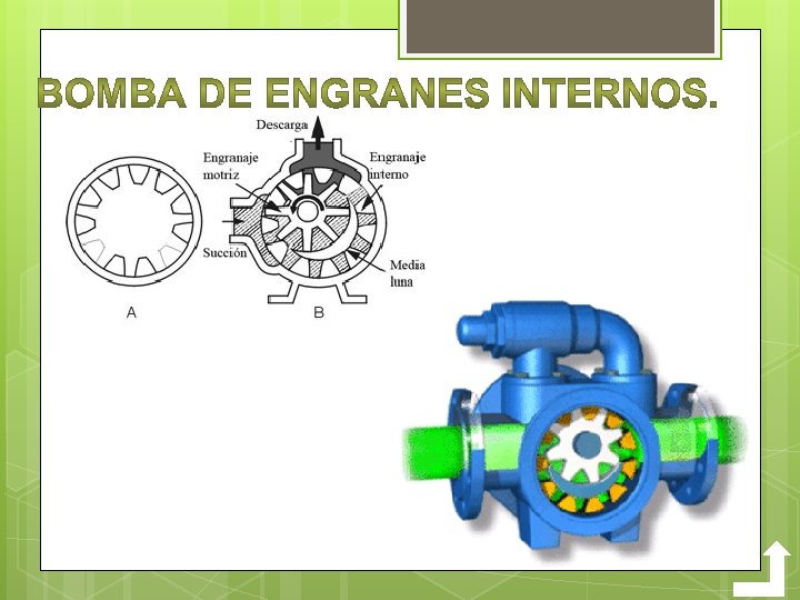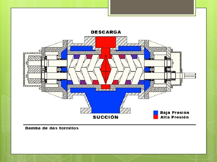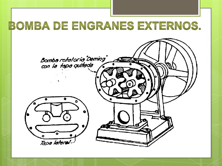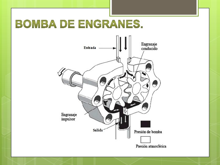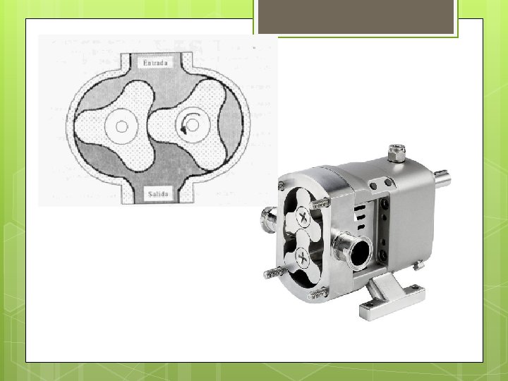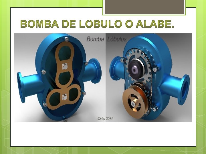 PRINCIPIO: NO TIENEN VALVULAS NI PARTES RECIPROCANTES. LA ACCION COMBINADA DE DOS ELEMENTOS GIRATORIOS SEMEJANTES A RUEDAS DENTADAS BOMBAS ROTATORIAS CARACTERÍSTICAS: PUEDE MANEJAR LIQUIDOS QUE CONTENGAN AIRE Y VAPOR APLICACIÓN: SE USA PARA MANEJAR LIQUIDOS ALTERNATIVAMENTE VISCOSOS, PUEDE CARECER DE VALVULAS DE ADMISION DE CARGA